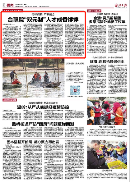 1月19日,臺州日報在在03版頭條位置刊發(fā)題為《臺職院“雙元制”人才成香餑餑》的文章,大篇幅報道臺職院中德學院國際化人才校企對接會的盛況,深度探尋中德學院雙元制人才培養(yǎng)模式積累的可復制、可推廣、可借鑒的經(jīng)驗。全文如下: